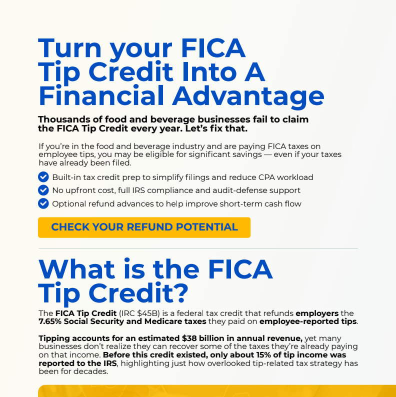 “Most restaurants and hospitality businesses are overpaying payroll taxes every quarter and don’t realize it. Billions in FICA Tip Credits go unclaimed every year, and unless you’ve partnered with a specialized provider, chances are you’re leaving thousands behind.”